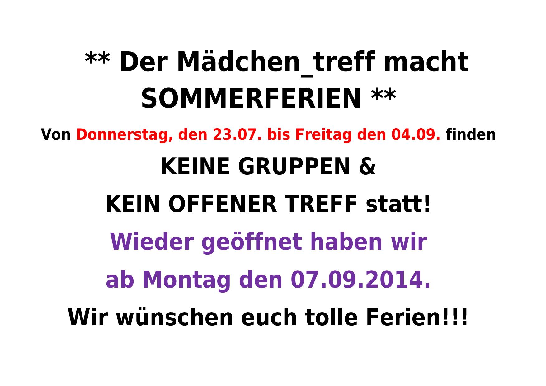 euch ab dem 07.09.2015 wieder im Mädchen_treff begrüßen zu können. Wir wünschen euch bis dahin schöne (und hoffentlich sonnige) Tage und Wochen! Liebe Grüße, euer Mädchen_treff Hastedt