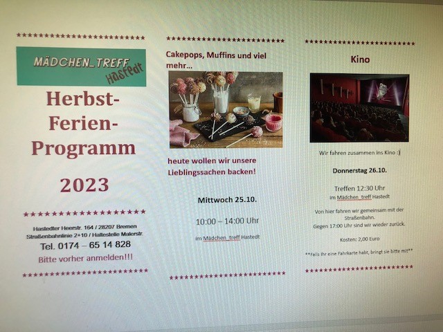 oder direkt im Mädchen_treff. Für den Ausflug in´s Kino brauchen wir die Einverständniserklärung Eurer Eltern. Die könnt Ihr vorher bei uns abholen.