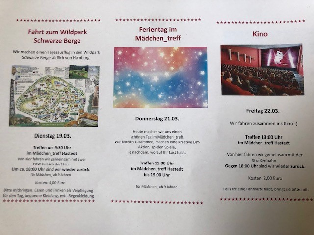 Endlich Ferien…..Wenn Ihr an einer oder mehrerer Aktionen teilnehmen wollt, müsst Ihr Euch vorher anmelden. Entweder kommt Ihr dazu im Mädchen_treff vorbei oder Ihr ruft uns unter 0174 6514828 an.